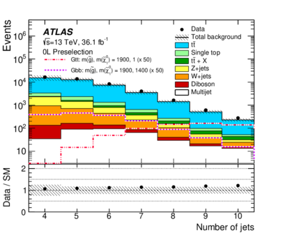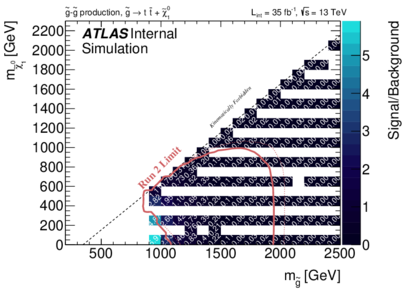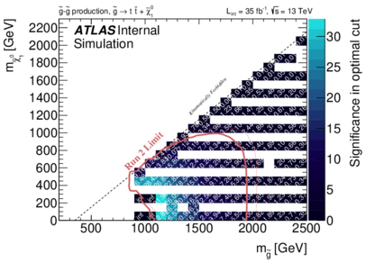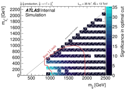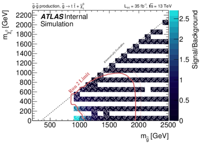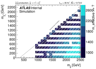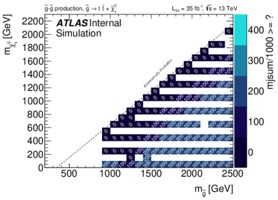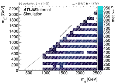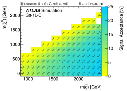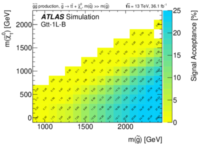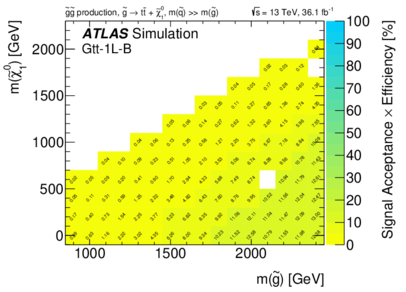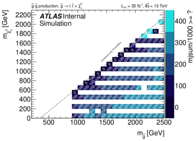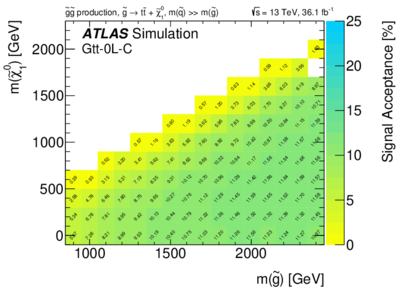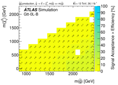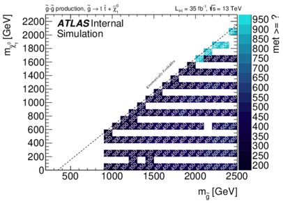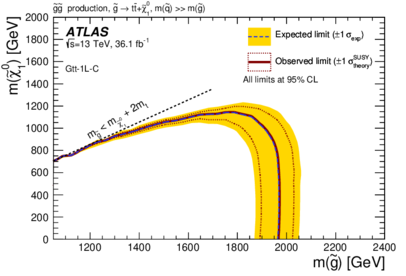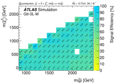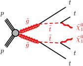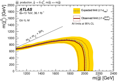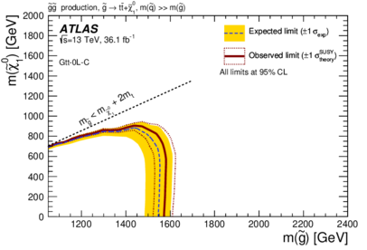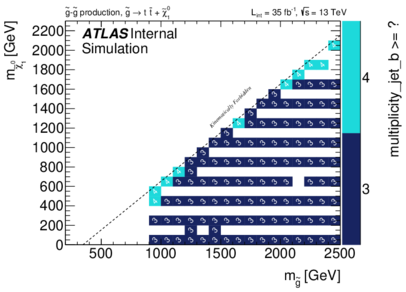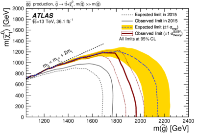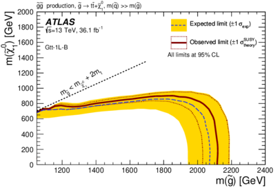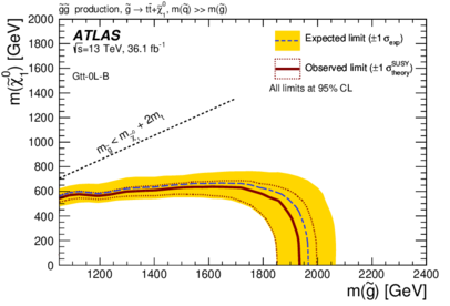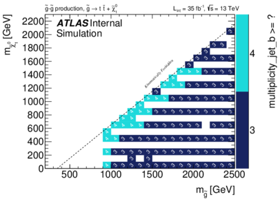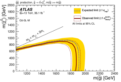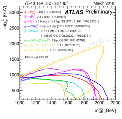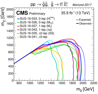 [253,254] Exclusion limits at 95% CL based on SI13TeV data for (a) ATLAS and (b) CMS in the (g̃, χ̃10) mass plane for different simplified models featuring the decay of the gluino to the lightest supersymmetric particle (lightest neutralino or gravitino) either directly or through a cascade chain featuring other SUSY particles with intermediate measses. For each line, the gluino decay mode is reported in the legend, along with the arXiv reference, and it is assumed to proceed with 100% branching ratio. Some limits depend on additional assumptions on the mass of the intermediate states, as described in the references provided in the plot (ATLAS [255,182,256,257,258,259,260]; CMS [261,262,263,264,265,266]). The search presented in this thesis is shown in magenta for ATLAS.